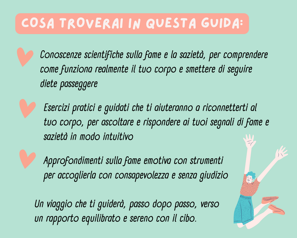 Scopri una guida pratica e scientifica che ti aiuterà a riconnetterti con il tuo corpo e con i segnali di fame e sazietà. Troverai conoscenze scientifiche sui meccanismi fisiologici che regolano l'appetito, con approfondimenti sulla fame emotiva. La guida include 8 esercizi pratici, pensati per aiutarti a sviluppare una relazione sana e consapevole con il cibo, che potrai svolgere comodamente in autonomia.